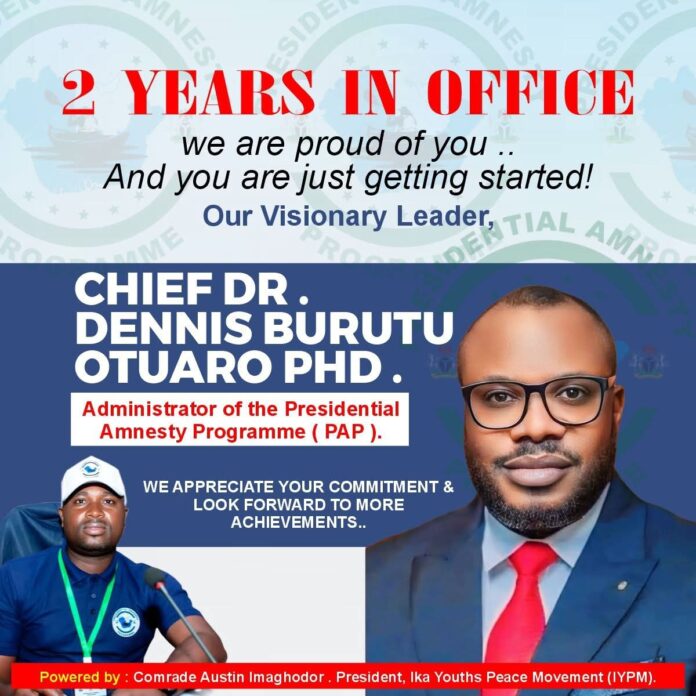 Comrade Austin Imaghodor, President of the Ika Youths Peace Movement (IYPM) and a prominent ex-agitator leader, has congratulated the Administrator of the Presidential Amnesty Programme (PAP), Dennis Burutu Otuaro, as he marks two years in office.